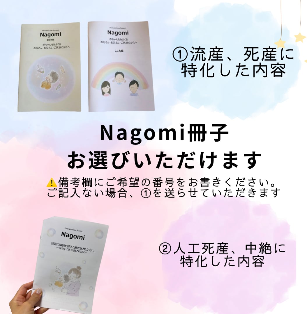 new!2025年Nagomi冊子 新発売!! 人工死産、人工妊娠中絶についての情報冊子『Nagomi冊子』 人工死産、人工妊娠中絶を経験された方々に寄り添うために作られた情報冊子です。 この冊子には、心に留めておきたい大切な情報や、赤ちゃんとの思い出作りについて、死産届けなどの手続きについてや、サポートについての内容がたくさん詰まっています。 皆様がこの冊子を通じて、少しでも心の安らぎを見つけられますように。 〈冊子内容〉 ◆情報…人工死産、中絶に関する最新の情報や、心のケアに関するアドバイスが掲載されています。 ◆形式…A5サイズ(A4の半分)で、読みやすいレイアウトにまとめています。 ◆ 個数…1冊 ◆色…優しいトーンで、心が和むデザインとなっています。 ⚠️お洋服や棺などの商品をご購入くださったかたには、1セットお受けしております。 〈このような方へ〉 ・中絶、人工死産を経験し、その後の生き方に悩んでいる方 ・大切な赤ちゃんを失ったことをどう受け入れたらよいか分からない方 ・情報を整理し、心の準備をしたいと考えている方 〈発送について〉 レターパックでの発送を行います。 ( ※天候や発送状況によって、発送方法を変更させていただく場合がございます。あらかじめご了承ください。 ※ご不明点がございましたら、お気軽にお声掛けください。 #中絶 #人工死産 #出生前診断 #Nagomi冊子 #流産 #死産 #グリーフケア #心のサポート #命の大切さ #お母さんの想い