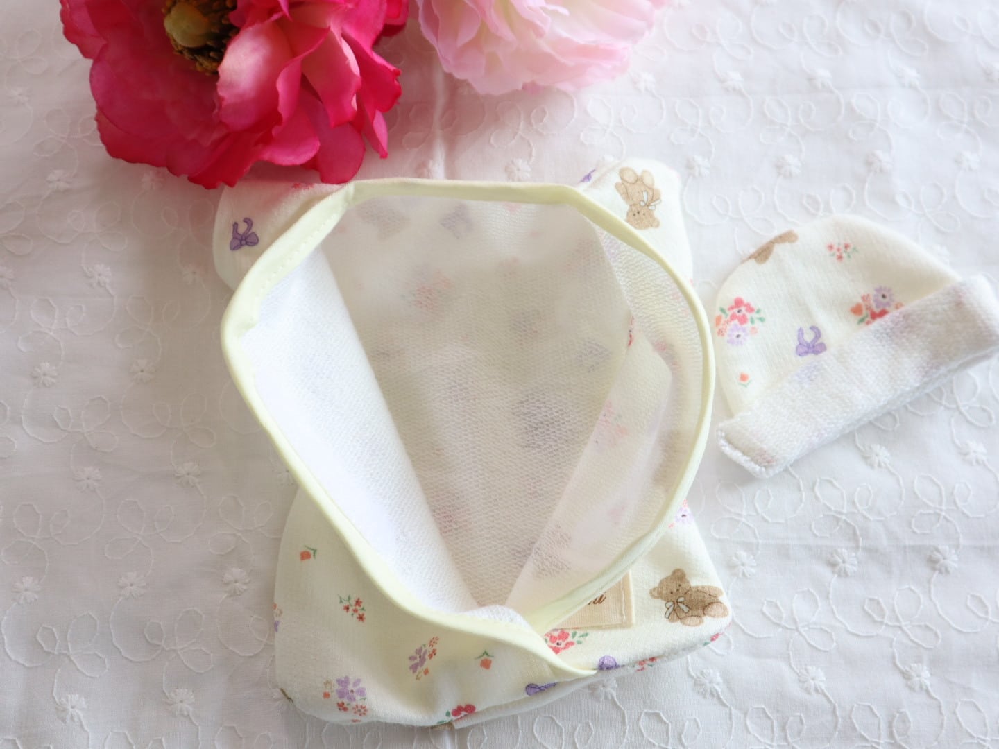 ・ニット型お帽子(ニット、イエロー、くまと小花)