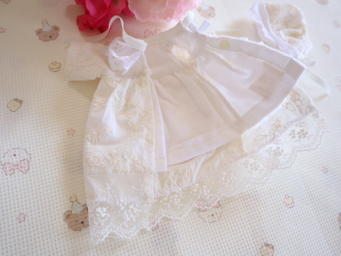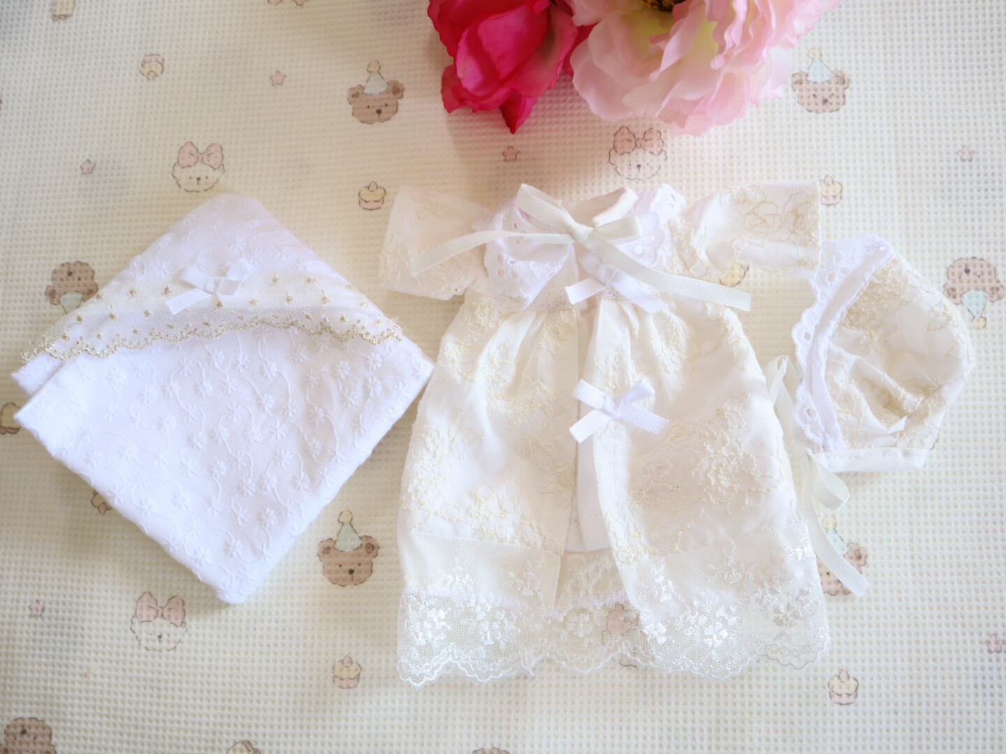 ・ベビードレス(表…レース、バラ刺繍柄、裏…フランネル)