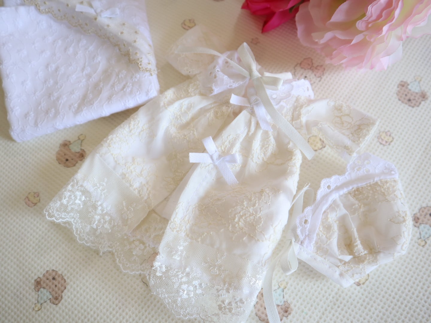 ・ベビードレス(表…レース、小花柄、裏…フランネル)