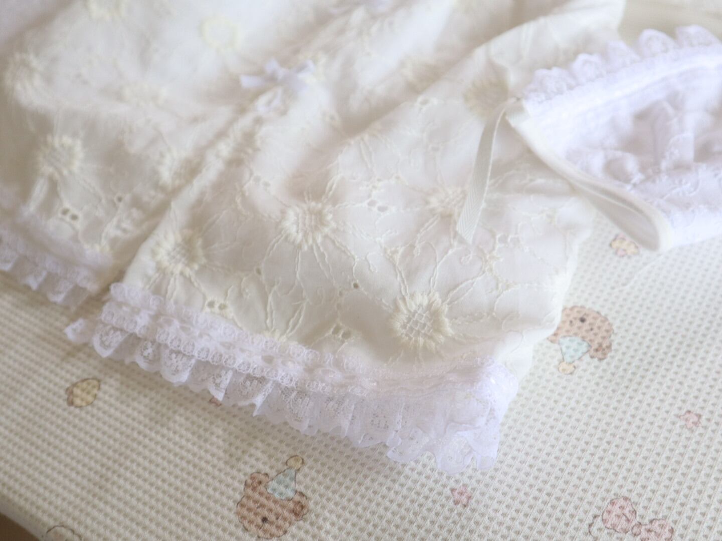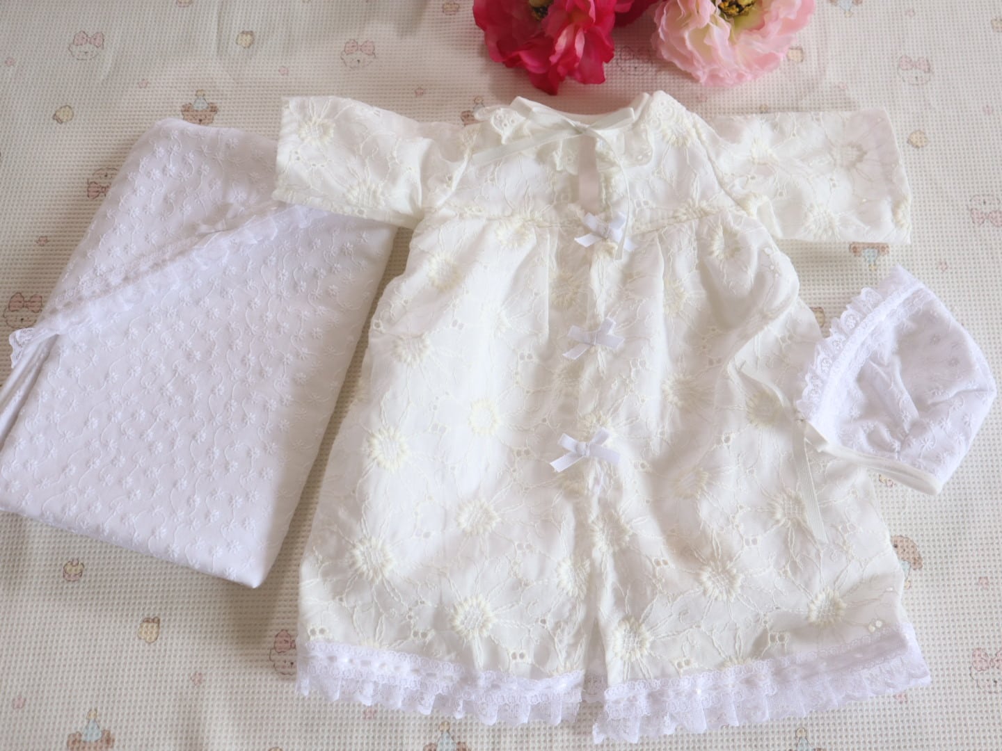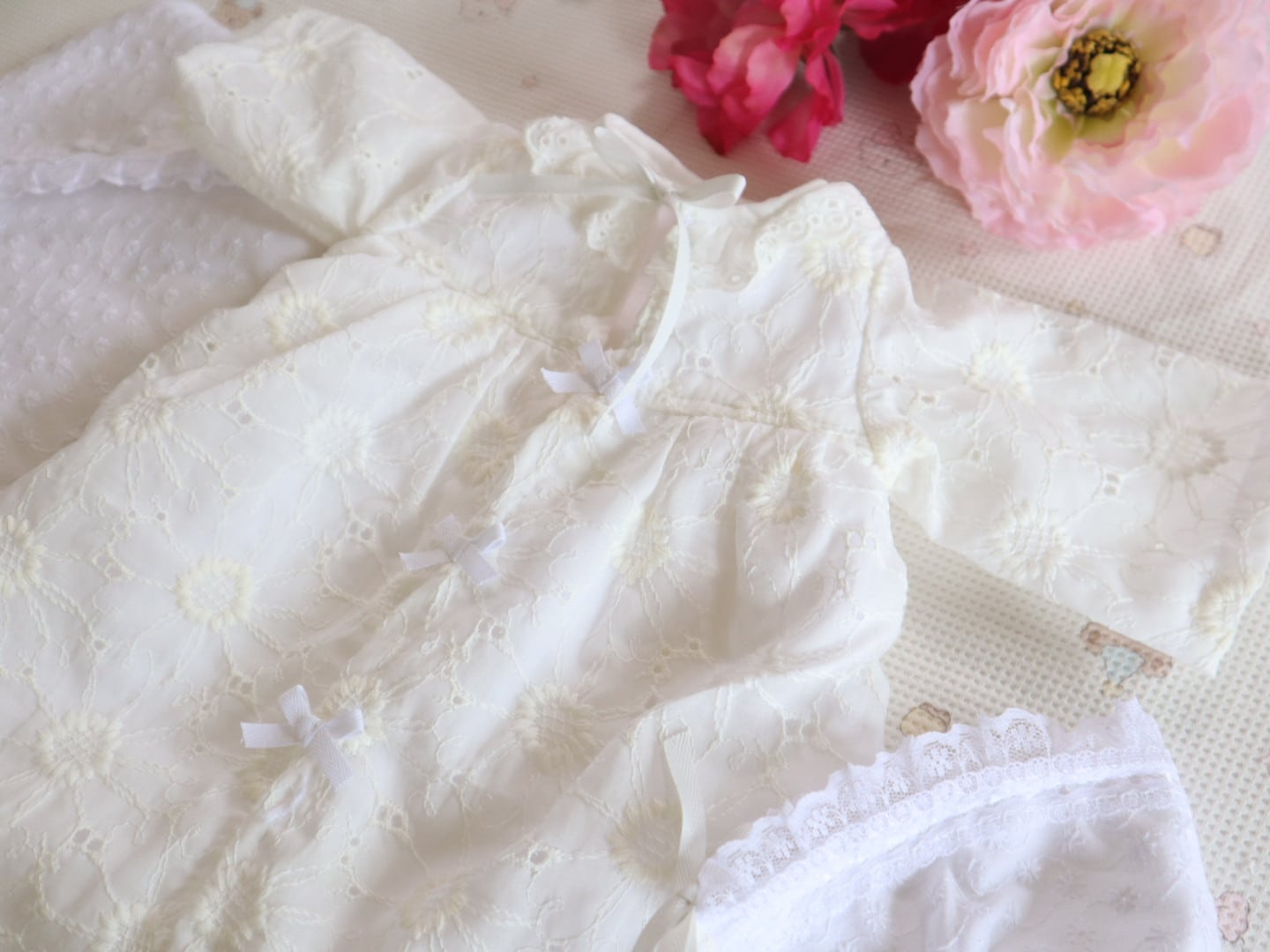 生地:コットン生地(綿100%) 、ポリエステル(ベビードレス表地に使用)、フランネル、エンゼルレース(ポリエステル製)