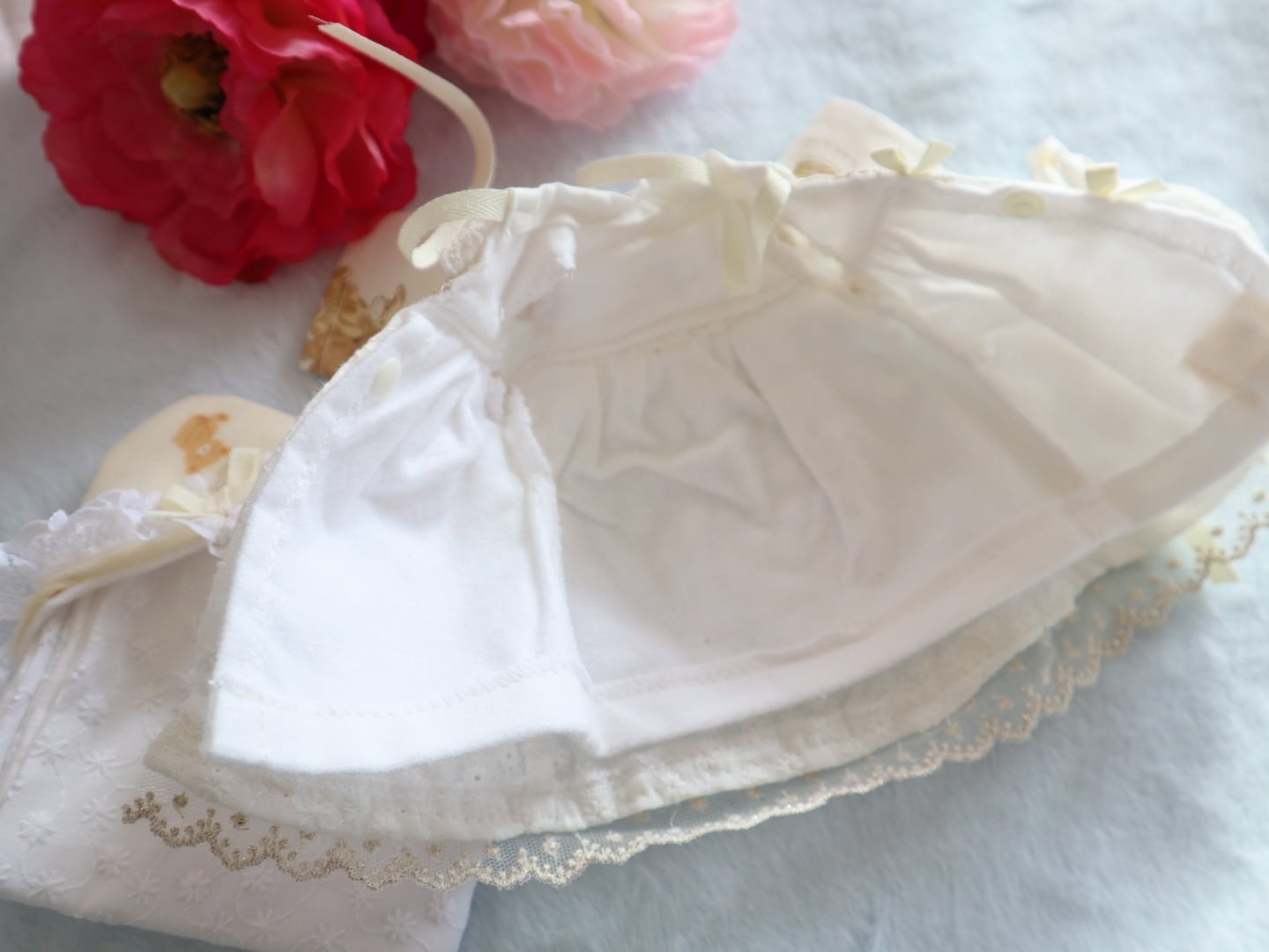 ・お帽子(表…シーチング、レース、くまとアヒル柄、裏…フランネル)
