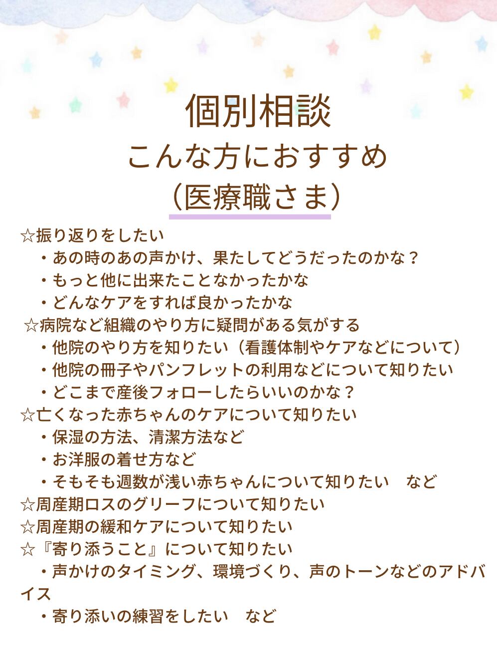 個別相談の担当者は、2019年に妊娠39週で『常位胎盤早期剥離』で死産を経験しており、尚且つ看護師・保健師免許、グリーフ専門士協会のbasic、advanceコース取得しているものが対応させてきただきます。