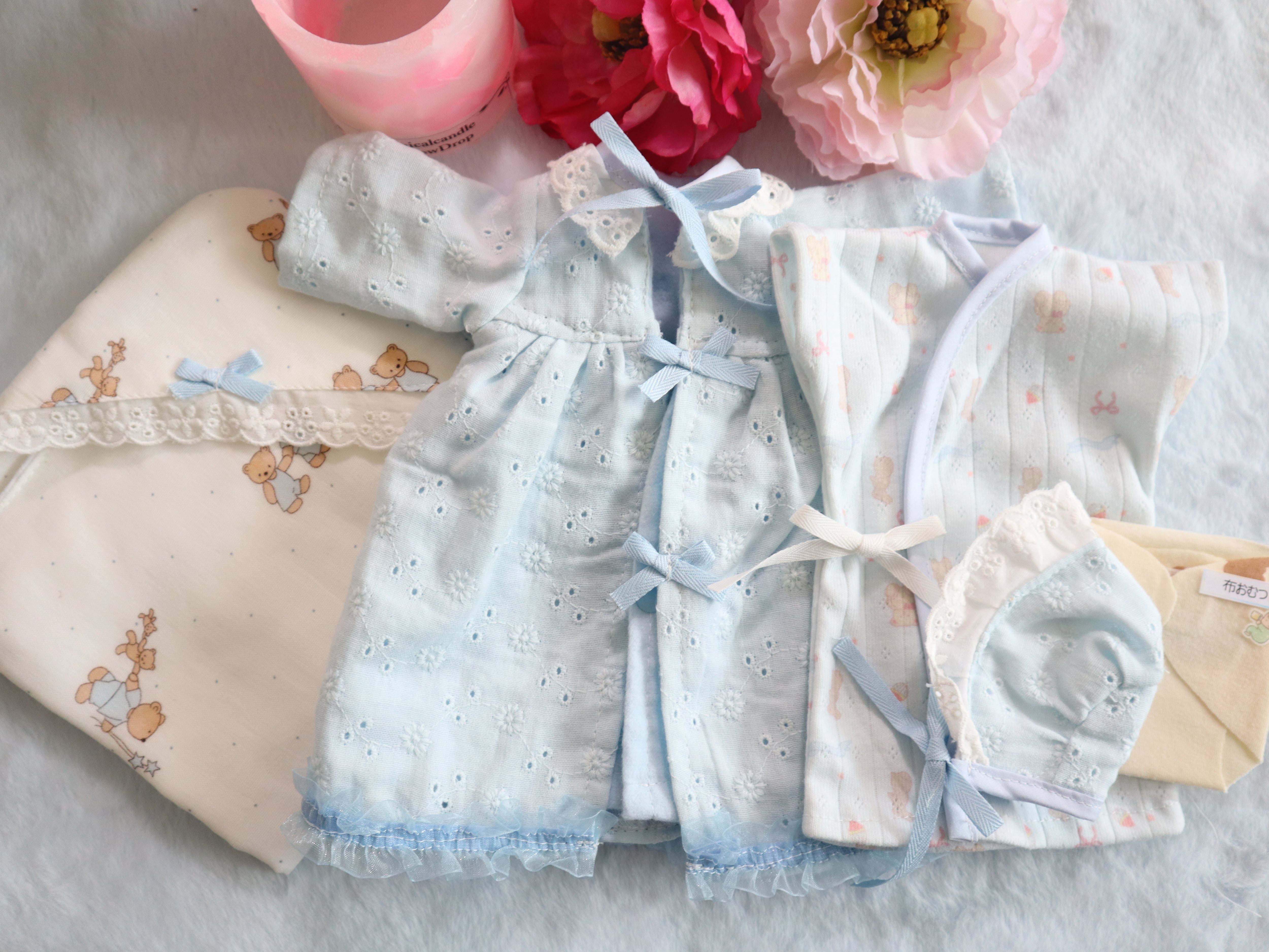 リボン:おくるみ、お帽子に使用しているレースにポリエステルが含まれております。