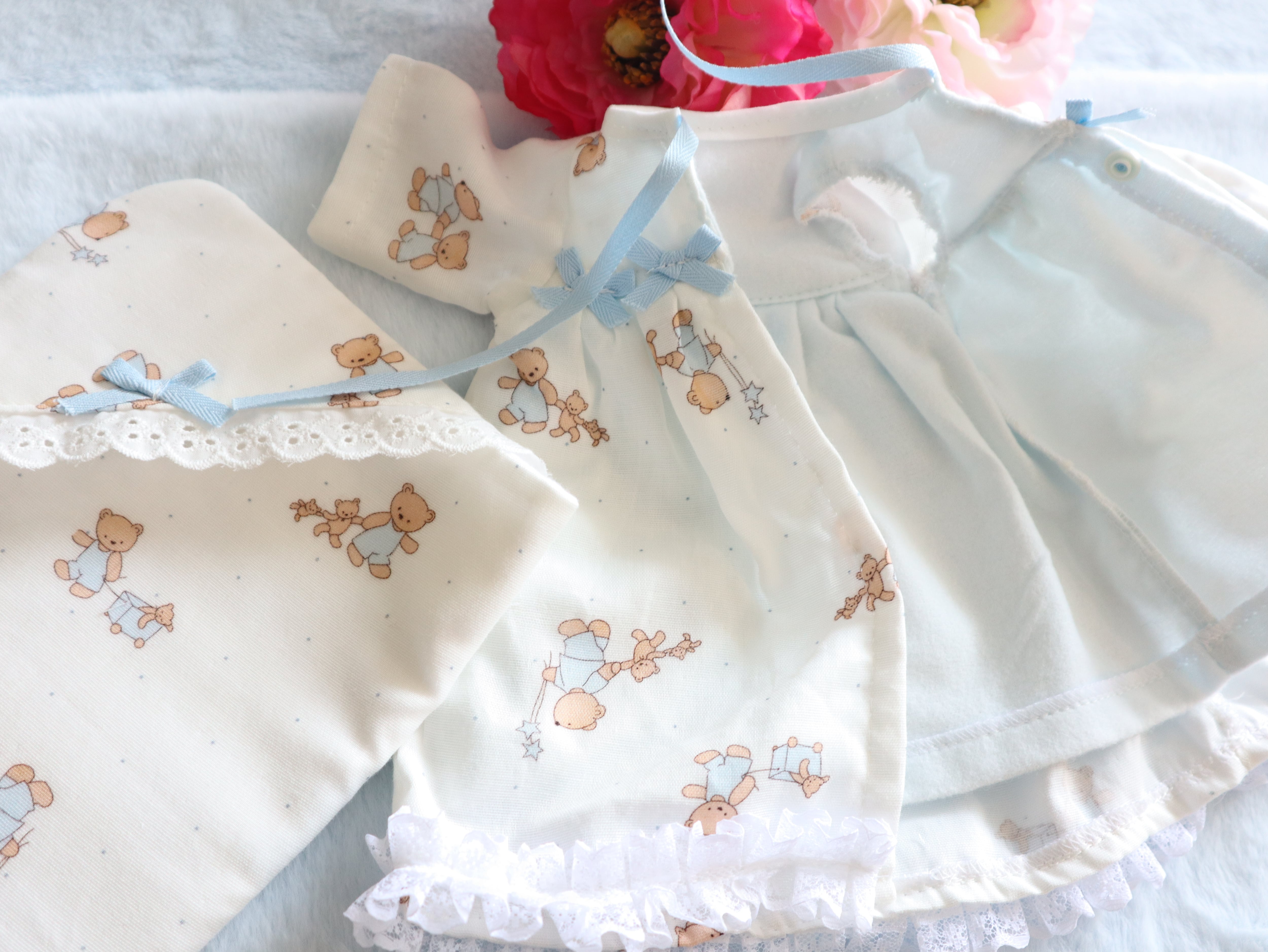 リボン:おくるみ、お帽子に使用しているレースにポリエステルが含まれております。