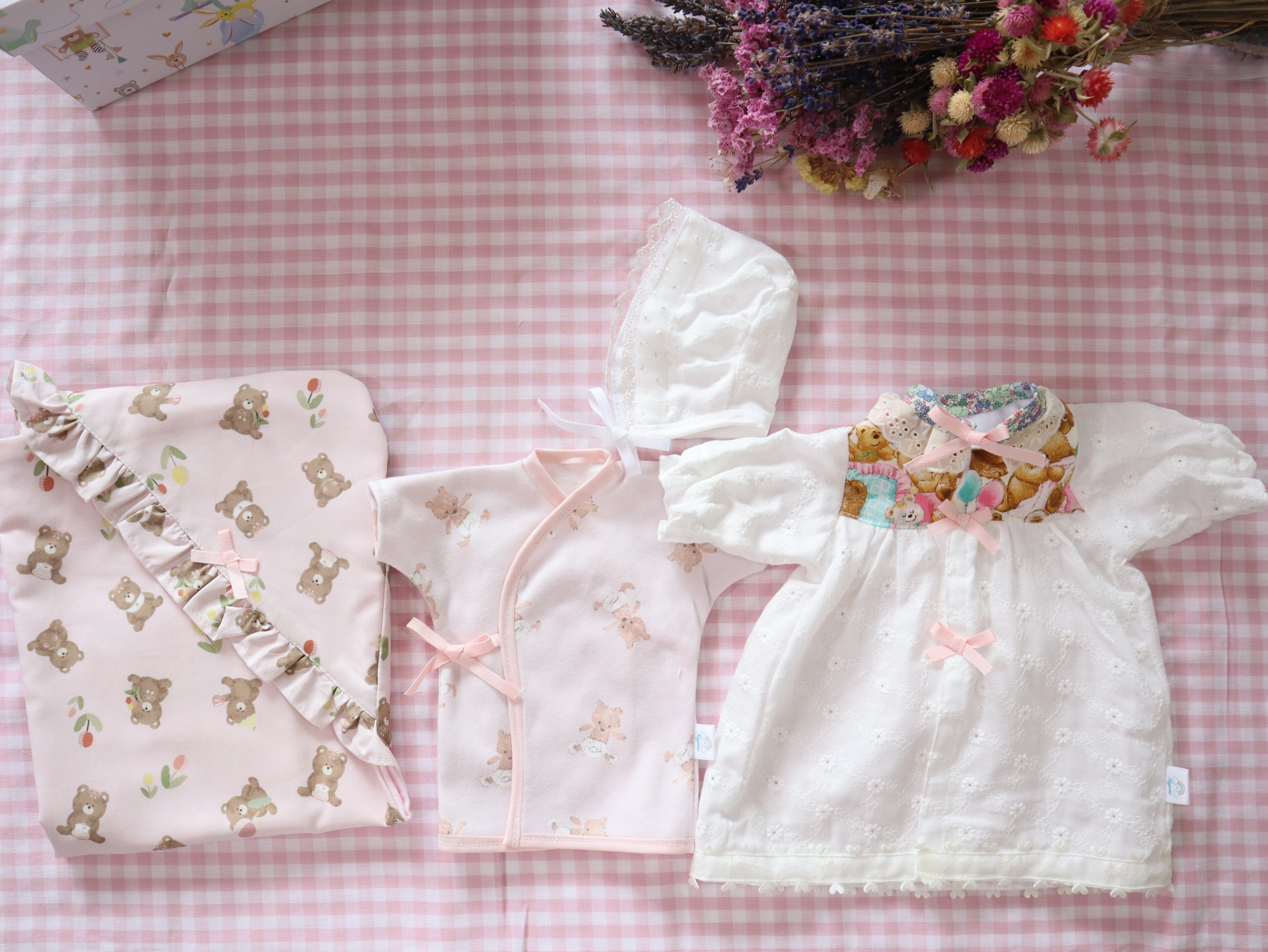 リボン:おくるみ、お帽子に使用しているレースにポリエステルが含まれております。