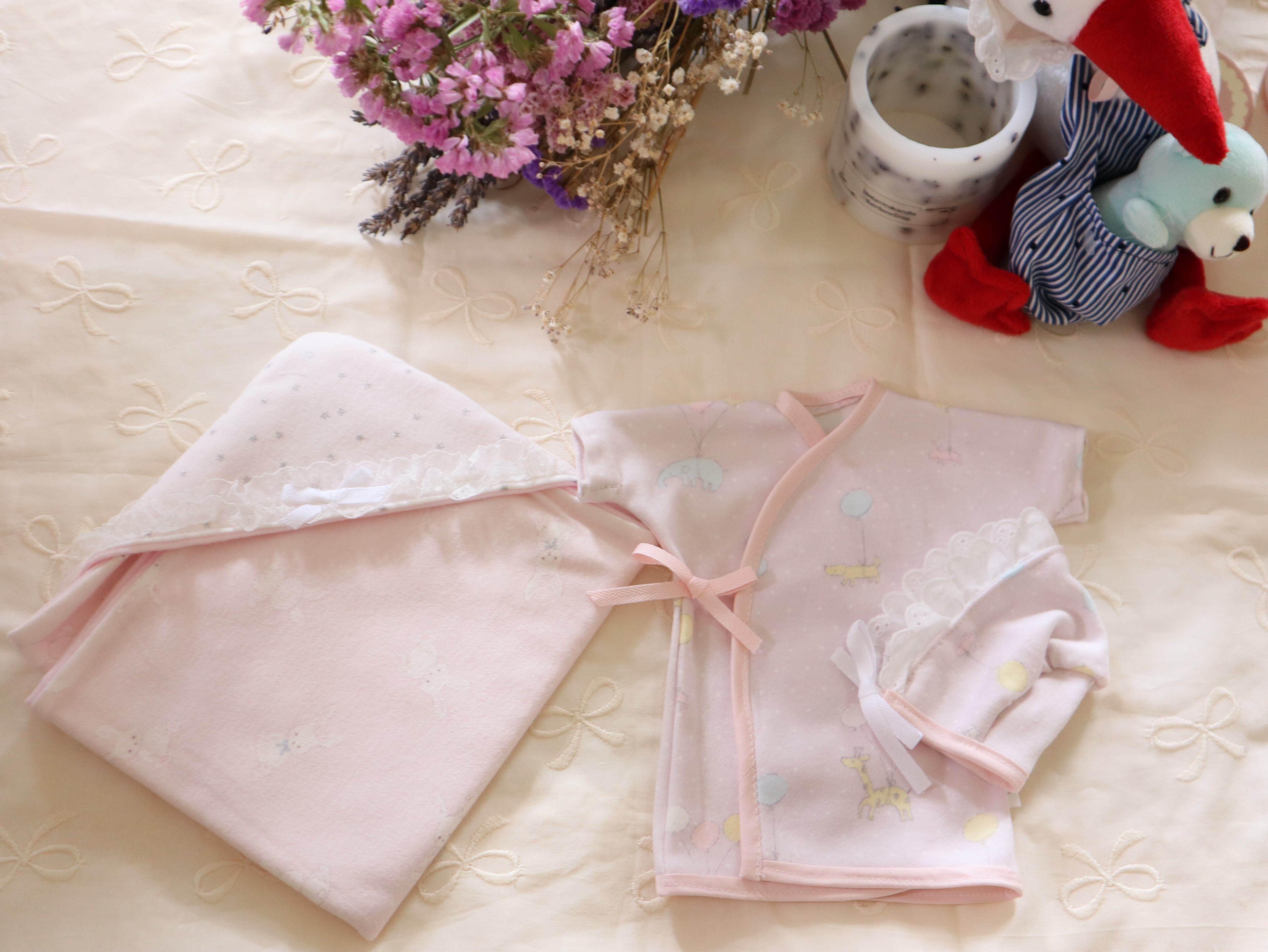 ・おくるみ(ピンクスムースニット、うさぎ、フランネル)