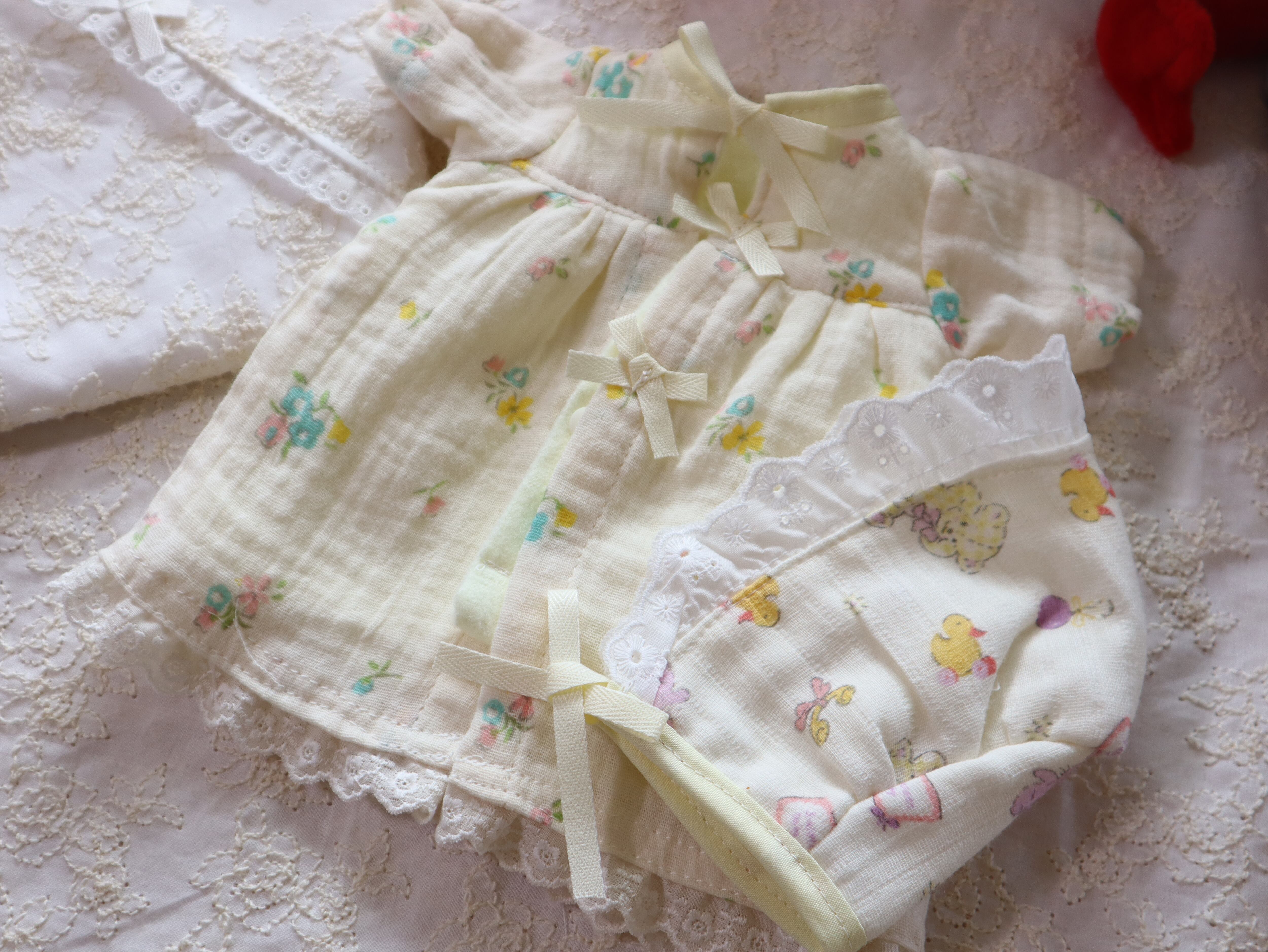 ・ベビードレス(表…ダブルガーゼと裾のレース、花柄、裏…フランネル)
