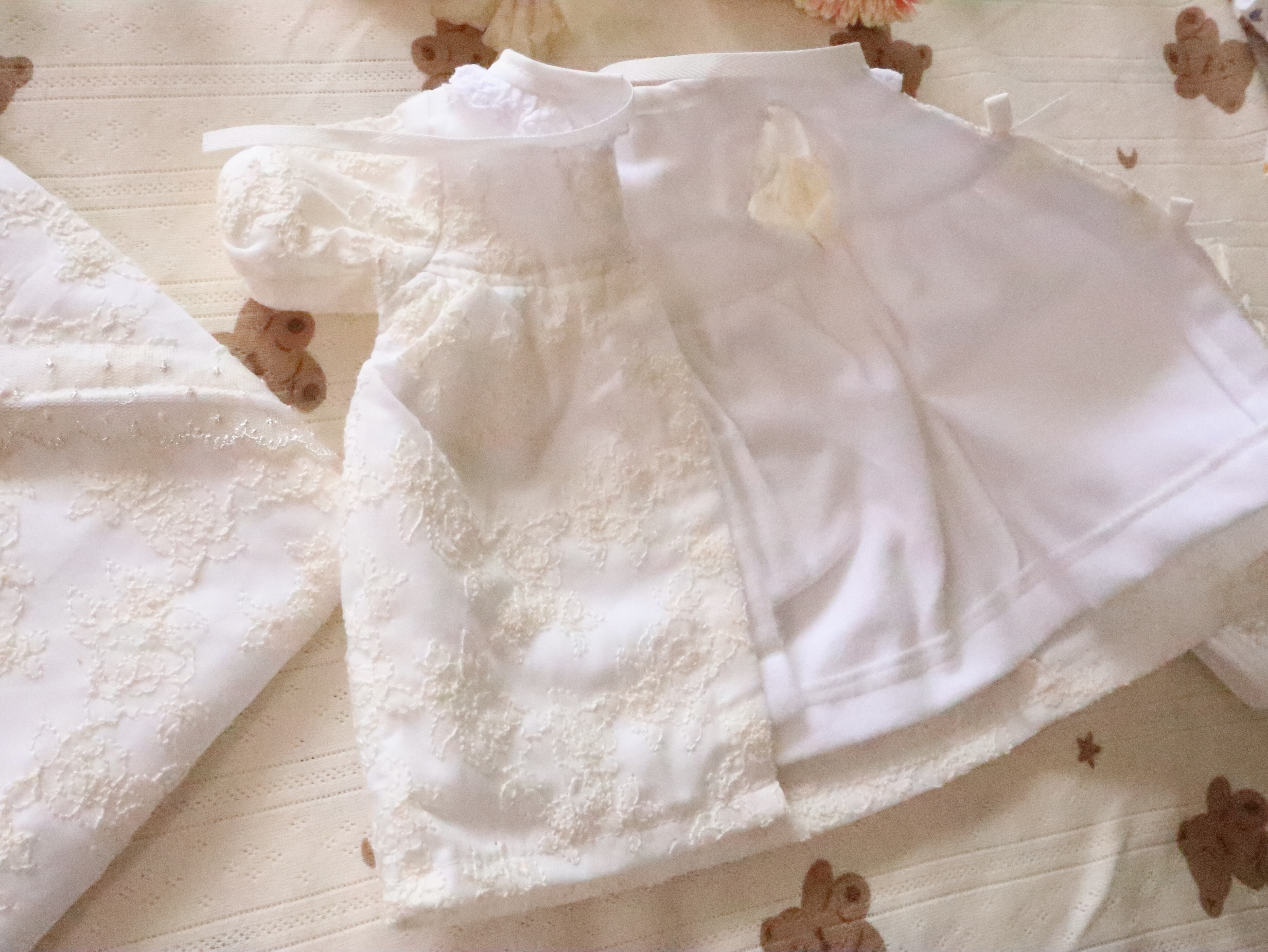 ・ベビードレス(表…ガーゼレース、ローズレース柄、裏…フランネル)