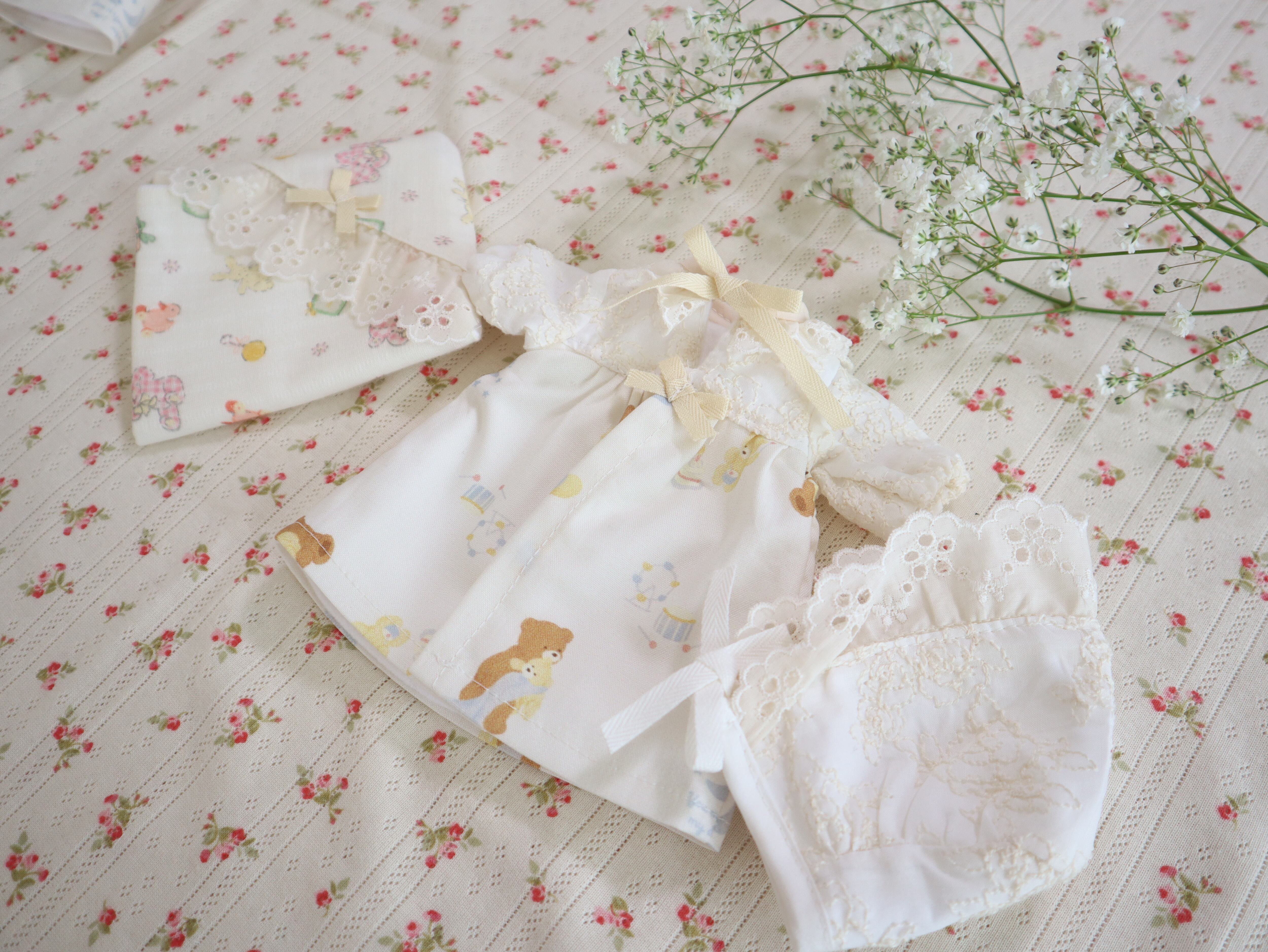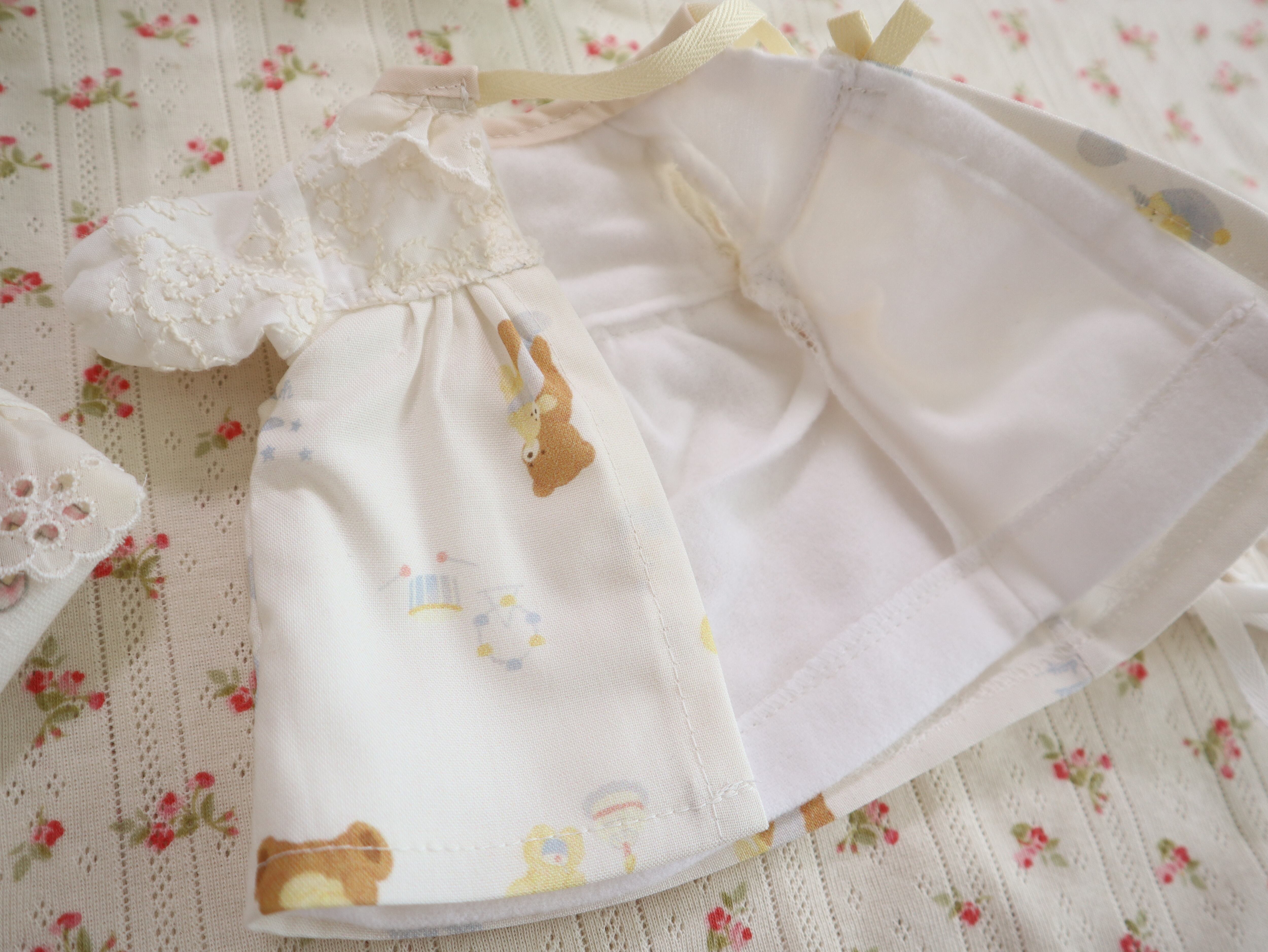 ・ベビードレス(表…ダブルガーゼ、レースと熊の親子と太鼓柄、裏…フランネル)